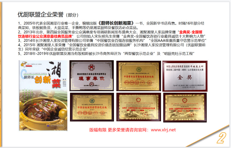 4、2015年 湘聚湘里人家荣膺“全国餐饮业最具投资价值连锁加盟品牌”长沙湘里人家投资管理有限公司(优厨联盟前生)同年荣获“中国企业诚信经营示范企业”